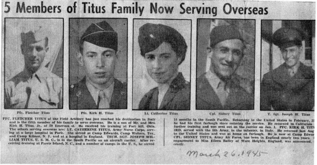 Near the end her life Catherine became an early financial supporter of the Wakefield World War II Monument Committee’s campaign to replace the aging wooden WWII monument with a new granite structure. She wanted to make sure that the six Titus veterans and all the other Wakefield service men and women of World War II would be permanently remembered.